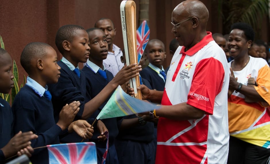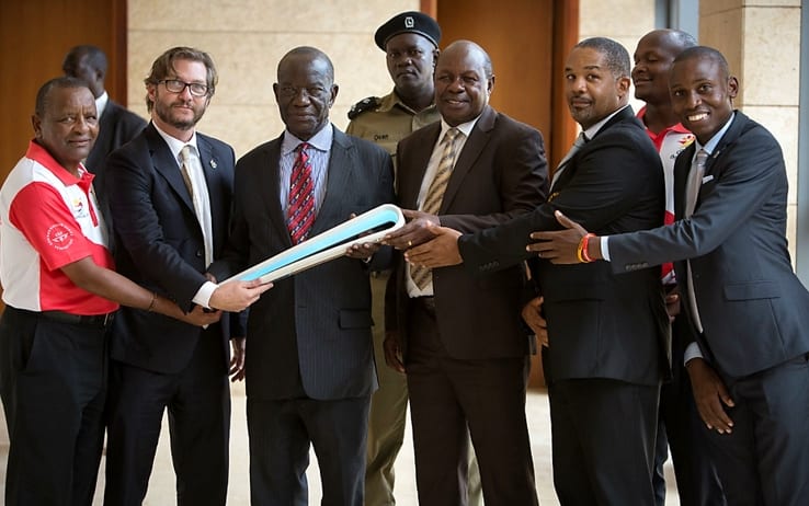 En Ouganda du 25 au 28 mars 2017 – Le « Queen’s Baton » est présenté ici par l’ambassadeur du Royaume-Uni à M. Edward Ssekandi, Vice-Président de l’Ouganda