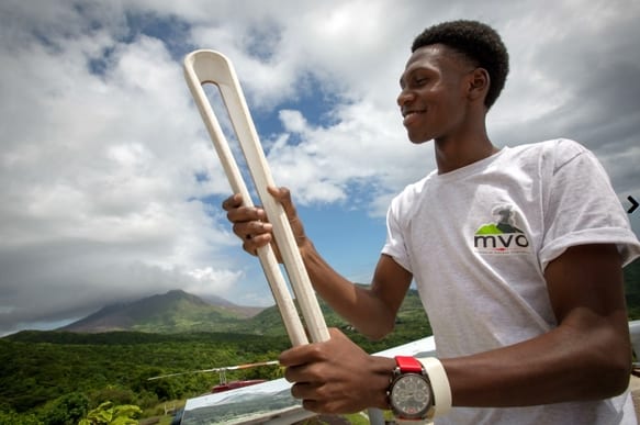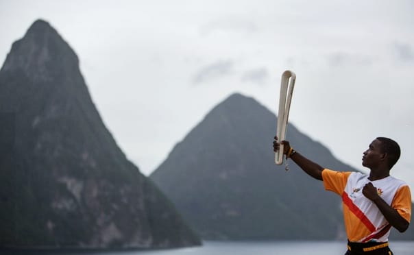 À Sainte Lucie le 12 juin 2017 – Le boxeur local Nathan Ferrari brandit le Queen’s Baton devant les célèbres pics de Sainte Lucie qui font la renommée de l’île dans toute la Caraïbe et au-delà.