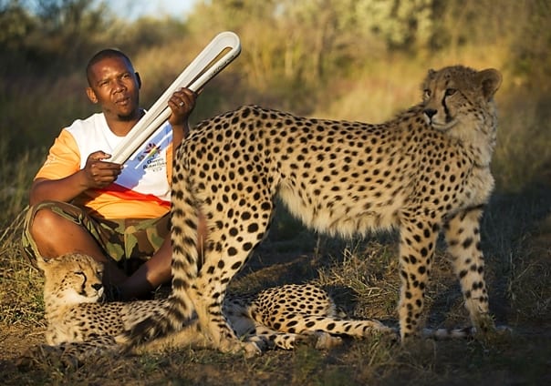 En Namibie le 2 mai 2017 – Le Queen’s Baton est tenu par un garde d’un parc animalier, avec un couple de guépards en premier plan