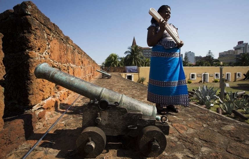 Au Botswana le 5 mai 2017 – Le Queen’s Baton est ici dans les mains des élèves de l’école primaire, habillés en costumes traditionnels, du Supang Memorial de Lelthakane, petite ville du Bostswana central, non loin du désert du KalahariAu Mozambique le 10 mai 2017 – Le Queen’s Baton est ici sur les remparts de la « Fortaleza de Maputo », la Forteresse de la capitale du Mozambique construite jadis par le Portugal. Ancienne colonie portugaise indépendante depuis 1974, le Mozambique a été le premier pays n’ayant aucun lien historique avec la Grande-Bretagne à adhérer au Commonwealth des Nations. C’était en 1995.