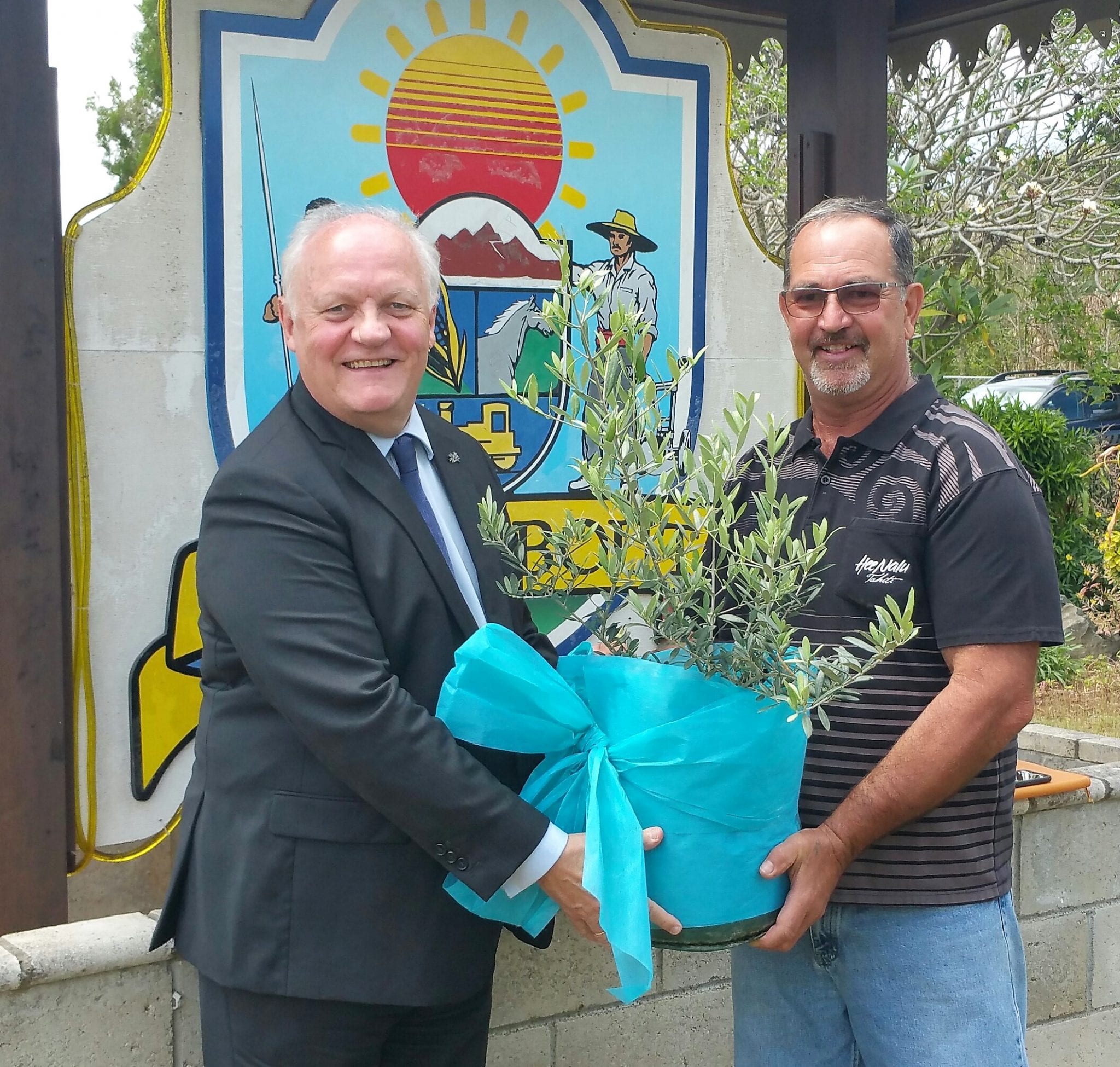 Pour les remercier de leur geste, François Asselineau a remis à chacun des deux maires un jeune olivier à planter, en expliquant que ce symbole revêtait une triple signification :