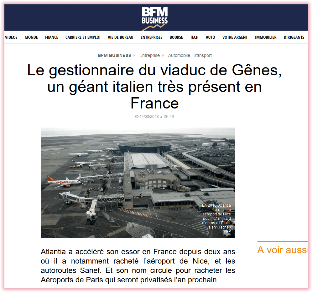 La société mère d’« Autostrade per l’Italia » qui gère le viaduc écroulé de Gênes n’est autre que le groupe Atlantia très présent en France par l’entremise notamment de l’exploitation des autoroutes Sanef (autoroutes du Nord et de l’Est de la France) – connues pour reverser 100 % de leurs profits en dividendes aux actionnaires – et de l’aéroport de Nice. Cette dernière concession avait été obtenue des mains mêmes de Macron lorsqu’il était à Bercy. Atlantia gère aussi les aéroports de Cannes et de Saint-Tropez, et a racheté en mars 2018 15 % du capital de l’ex-Eurotunnel qui gère le tunnel sous la Manche. Atlantia est, enfin, l’un des deux candidats jugés sérieux pour la reprise d’Aéroports de Paris que Macron veut, justement, aussi privatiser.