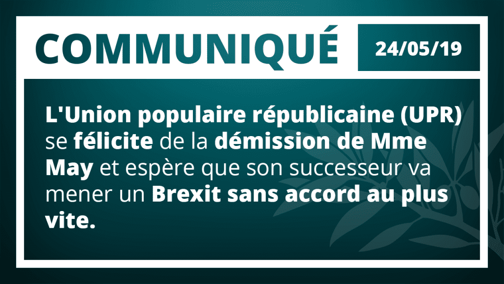 COMMUNIQUÉ DE PRESSE : L’Union populaire républicaine (UPR) se félicite de la démission de Mme May et espère que son successeur va mener un Brexit sans accord au plus vite.
