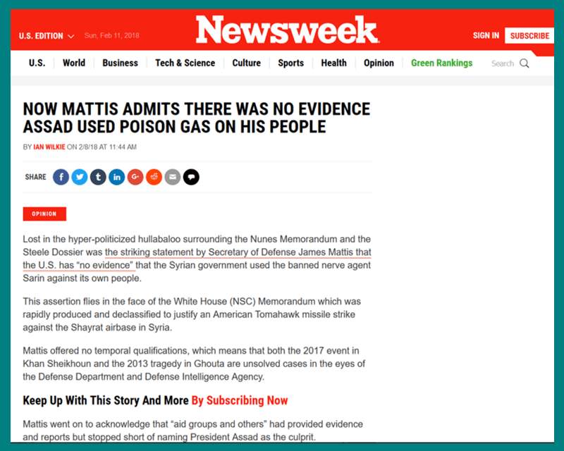 Le Secrétaire américain à la Défense, James Mattis, a reconnu vendredi 2 février 2018 que les États-Unis d’Amérique n’ont jamais eu la moindre preuve démontrant que le gouvernement syrien avait utilisé du gaz toxique contre sa propre population, qu’il s’agisse de la tragédie de la Ghouta survenue en août 2013 ou de la tragédie de Khan Cheikhoun survenue en avril 2017.