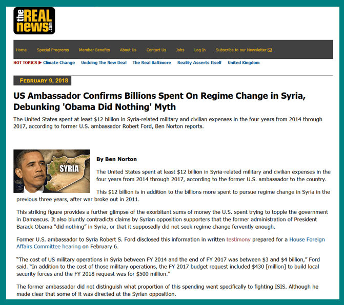- 2°) Elles démontrent que le gouvernement américain a dépensé des sommes colossales pour soutenir les prétendus « rebelles » syriens, ce qui constitue une ingérence dans les affaires intérieures syriennes, en violation flagrante du droit international et de la Charte des Nations-unies, en particulier son article 2, alinea 4. Elles révèlent au monde entier l’attitude mensongère et criminelle de Washington qui prétendait ne pas agir directement en Syrie, notamment sous l’administration Obama.