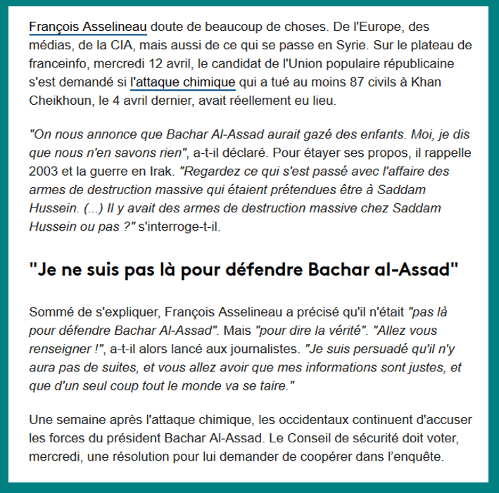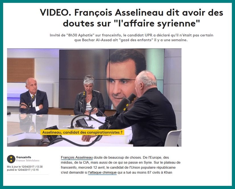 - 4°) Ces informations ont aussi une vertu pédagogique pour les électeurs français : elles démontrent que, pendant la campagne présidentielle française de 2017, François Asselineau a eu raison de refuser d’attribuer au gouvernement syrien la responsabilité du massacre de Khan Cheikhoun tant que l’on ne disposait pas de preuve convaincante. Le président de l’UPR a maintenu cette position en refusant toute intimidation, alors que certains journalistes, piétinant sans vergogne la déontologie de la Charte de Munich régissant leur profession, s’érigeaient en une sorte de tribunal de la pensée unique euro-atlantiste. Ce fut notamment le cas sur France Info le 12 avril 2017, où François Asselineau a dû subir l’assaut unanime des journalistes, qui l’insultaient en le qualifiant de « candidat des complotistes » et le « sommaient de s’expliquer » parce qu’il refusait d’accuser Bachar Al Assad sans aucune autre preuve que les communiqués du gouvernement américain.