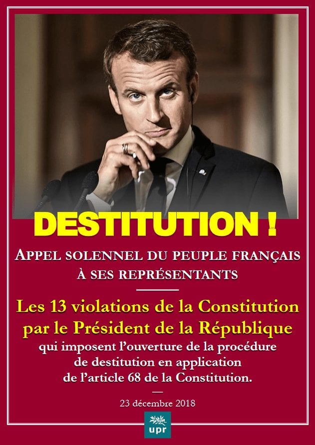 L’UPR appelle donc les Français à se saisir de ce dossier et à demander sans relâche à leurs députés et sénateurs le lancement de la procédure de destitution de Macron en application de l’article 68 de la Constitution.