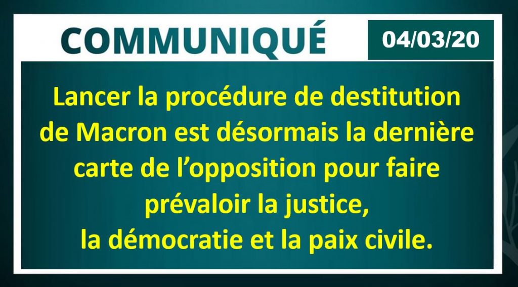 Alors que les Français font face à une situation politique et sociale bloquée, le lancement de la procédure de destitution de Macron pour « manquement à ses devoirs manifestement incompatible avec l’exercice de son mandat » est la dernière carte qui reste à l’opposition pour faire prévaloir le droit, la justice, la paix civile et la démocratie.