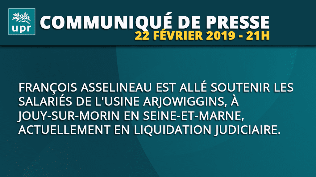 François Asselineau, président-fondateur de l’Union Populaire Républicaine (UPR) et tête de liste aux prochaines élections européennes, est allé soutenir les salariés de l’usine Arjowiggins, à Jouy-sur-Morin en Seine-et-Marne, actuellement en liquidation judiciaire. (Voir la captation vidéo de cette journée sur la chaîne Youtube UPR TV qui sera diffusée le samedi 23 février 2019 à 20h).