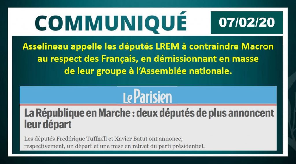 François Asselineau appelle les députés LREM et apparentés à démissionner de leur groupe à l’Assemblée nationale pour montrer qu’ils ont entendu la fureur des Français à l’encontre de Macron, notamment concernant la réforme des retraites, et qu’ils refusent le mépris dans lequel l’exécutif les tient par ailleurs.