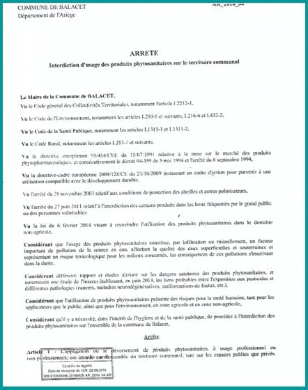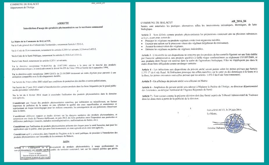 L’Union populaire républicaine (UPR) s’étonne de la récente invalidation, par des préfectures et par la justice, d’arrêtés municipaux anti-produits phytosanitaires, puisque le maire UPR de Balacet (Ariège), Antoine Duburcq, avait pris un arrêté identique dès le 29 juin 2016, voici plus de trois ans.