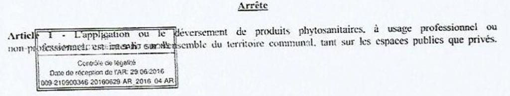 « Article 1 – L’application ou le déversement de produits phytosanitaires, à usage professionnel ou non-professionnel, sont interdits sur l’ensemble du territoire communal, tant sur les espaces publics que privés ».