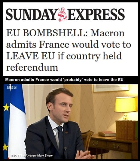 Plusieurs médias britanniques, notamment le Daily Mail et le magazine « Express », ont été stupéfaits par un passage au cours duquel M. Macron explique que les Français voteraient probablement pour le « Frexit » si la question leur était posée, comme elle l’a été aux Britanniques, par référendum, s’agissant du « Brexit ».