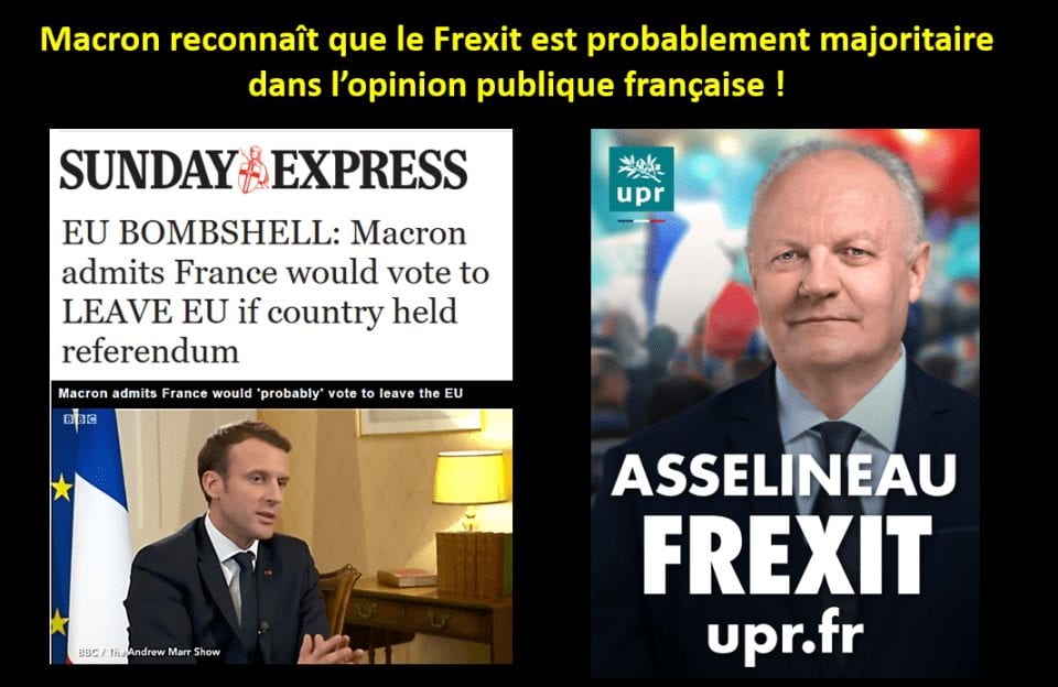 - 1) D’abord parce que cet entretien a été donné en anglais par le président français, ce qui ne le rend pas directement compréhensible pour de nombreux Français. Nos compatriotes vont donc rester dans l’ignorance de l’aveu spectaculaire de M.Macron sur le « Frexit », aveu qui légitime totalement l’existence et les objectifs mêmes de l’UPR !