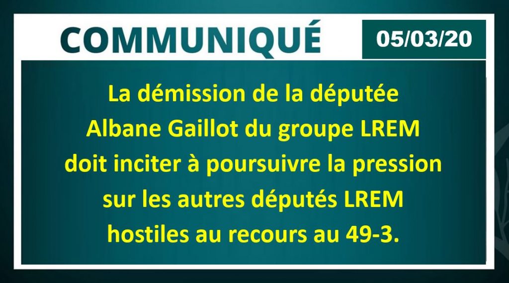 - notre communiqué de presse du 7 février 2020 invitant les députés de la majorité à démissionner en masse de leur groupe,