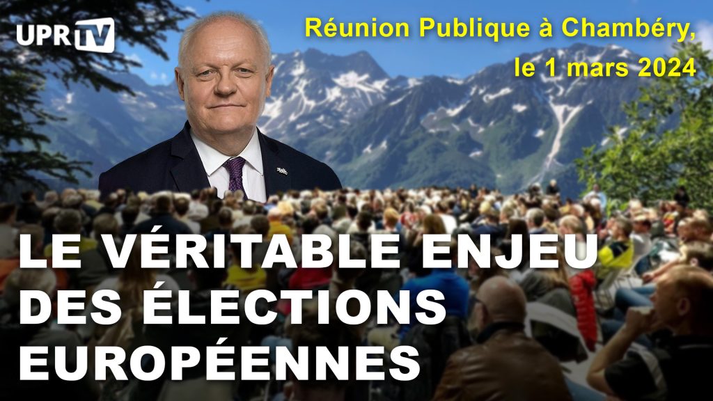François Asselineau a tenu une réunion publique à Chambéry, dans la Savoie, le 1er mars 2024, sur le thème : « Le véritable enjeu des élections européennes ».