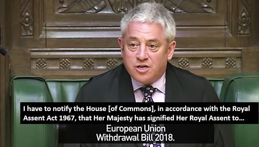 C’est le président de la chambre des Communes, John Bercow, qui a annoncé ce 26 juin 2018 que la reine Elizabeth II avait donné sa « Sanction royale » au texte de loi sur le Brexit présenté en juillet 2017 par le gouvernement conservateur de Theresa May, adopté la semaine dernière par le Parlement britannique.