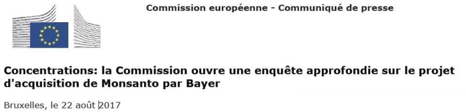 Le 22 août 2017, la commission européenne annonçait par communiqué de presse qu’elle lançait une « enquête » relative à cette fusion Bayer/Monsanto :