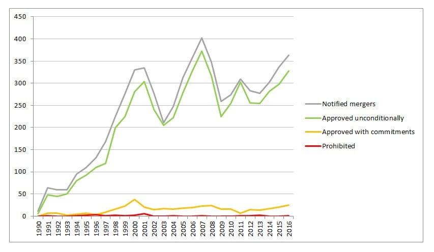 Graphique 2 : Fusions notifiées à la commission européenne, 1990-2017 (source)