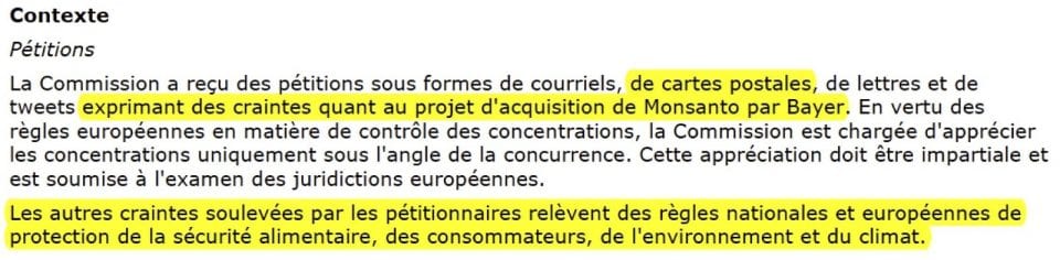 - La commission prétend que certaines pétitions sont exprimées sous forme de cartes postales (il ne s’agit pas d’une faute de traduction, la version Anglaise du texte évoque bien des “postcards”). Qui donc aujourd’hui pétitionne par cartes postales ? C’est une façon de dénigrer, la contestation des citoyens. Or il suffit de taper « pétition bayer monsanto » ou « campaign bayer monsanto » dans un moteur de recherche pour se rendre compte de l’ampleur de ces mouvements, à l’échelle mondiale.