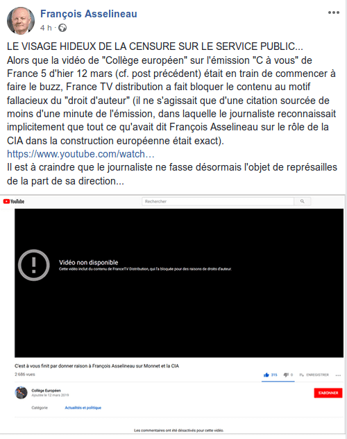 Mais l’édifice de la propagande et du mensonge commence à s’effondrer : l’émission « C à vous » sur la chaîne France 5 du 12 mars 2019 vient en effet de confirmer en direct les informations de François Asselineau sur Monnet et son financement par la CIA :