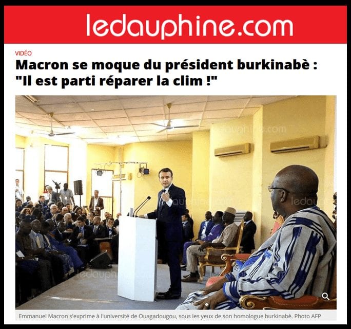 C’est alors que s’est déroulée une scène aussi inattendue que révélatrice. En réponse à une question sur les coupures de courant électrique, habituelles localement, Macron a montré de la main le président du Burkina Faso, Roch Kaboré, en déclarant : « C’est le travail du président ». Roch Kaboré a alors quitté la salle pour une raison inconnue (en signe de protestation ? pour une autre raison ?). « Du coup il s’en va », a cru bon de lancer Macron devant l’auditoire, en l’interpellant publiquement par un tutoiement : « Reste-là ! », avant de conclure par une plaisanterie stupéfiante de désinvolture à l’égard d’un chef d’État étranger : « Du coup, il est parti réparer la climatisation ! ».