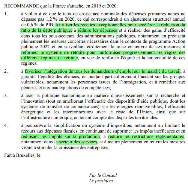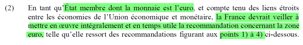 Le document précise que, « en tant qu’État membre dont la monnaie est l’euro, et compte tenu des liens étroits entre les économies de l’Union économique et monétaire, la France devrait veiller à mettre en œuvre intégralement et en temps utile la recommandation concernant la zone euro, telle qu’elle ressort des recommandations figurant aux points 1) à 4) ci-dessous ».