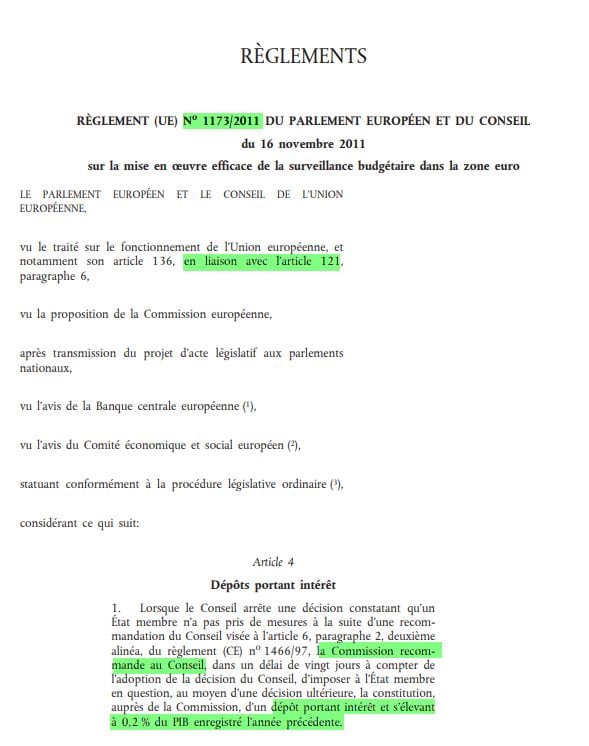 Ce règlement qui a été complété le même jour, le 16 novembre 2011, par le 1173/2011, explicite l’amende de 0,2 % du PIB sous forme de dépôt en cas de non-respect des GOPÉ. Pour la France, le dépôt est de l’ordre de 4,6 milliards d’euros et ne sera restitué que si les réformes sont mises en œuvre. Ce sont donc de facto des obligations.