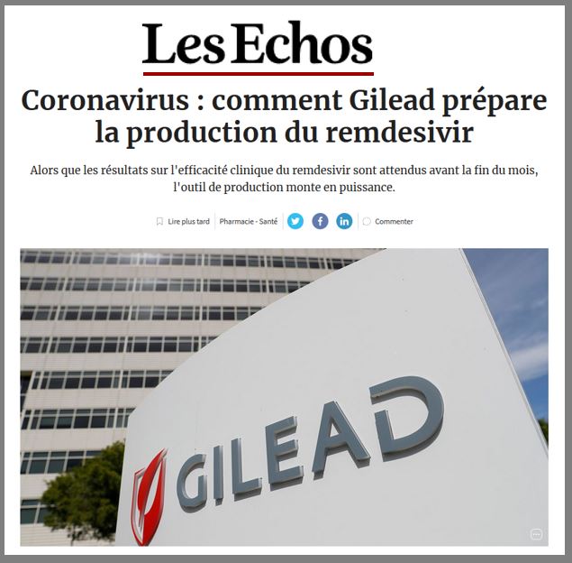 Dans un tel contexte, l’information divulguée par le journal Les Échos du 6 avril 2020 renforce encore le sentiment de malaise qui entoure toute cette affaire. On y apprend en effet que GILEAD SCIENCES fait actuellement monter en puissance son outil de production du Remdesivir, et cela alors que les résultats sur l’efficacité clinique de ce nouveau médicament ne sont attendus qu’à la fin du mois.