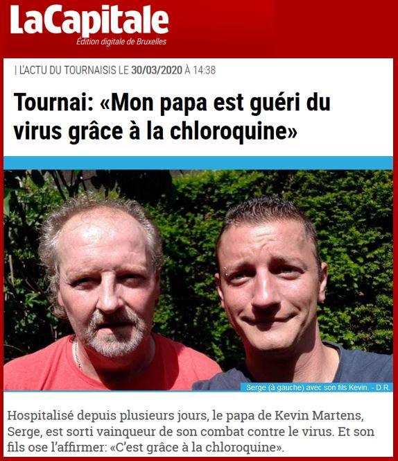 Ici Le journal belge La Capitale du 30 mars 2020 donne la parole à Kevin Martens, qui explique que son père a été guéri du covid-9 grâce à la chloroquine.