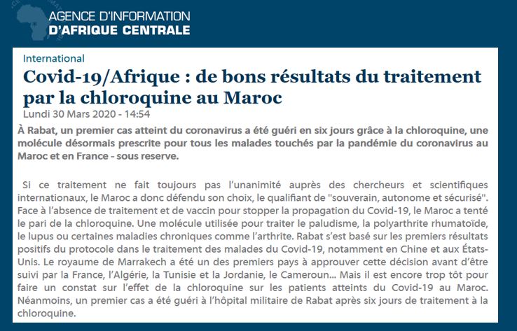 Ici l’Agence d’information d’Afrique centrale signale, le 30 mars 2020, que ce médicament semble donner de bons résultats au Maroc, qui a décidé d’y avoir recours massivement, comme l’Algérie, la Tunisie, la Jordanie et le Cameroun.
