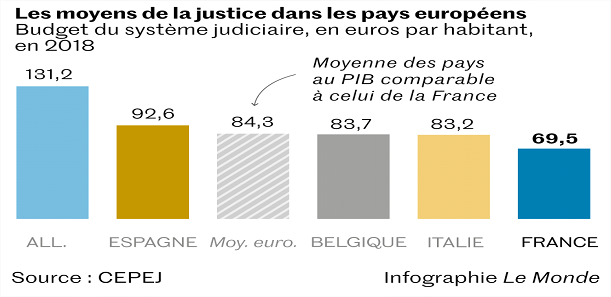 Ce constat émane également du Conseil de l’Europe : tandis que la France consacre 69,90 € par habitant à la justice, l’Allemagne en consacre 131,2 € soit près du double, l’Allemagne consacre 0,32% de son PIB alors que la France en consacre 0,20%.