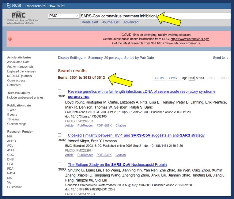 Comme tout lecteur pourra s’y essayer lui-même, il suffit par exemple de cliquer les mots « SARS-CoV + coronavirus + treatment + inhibition » pour que le moteur de recherche de la Bibliothèque nationale de Médecine des États-Unis communique instantanément les références de 3 612 études (!) dans lesquelles figurent ces mots-clés :