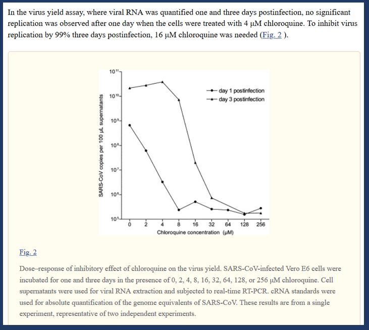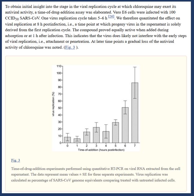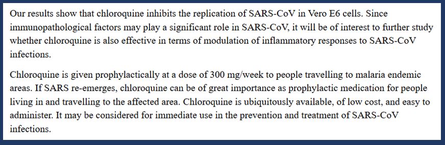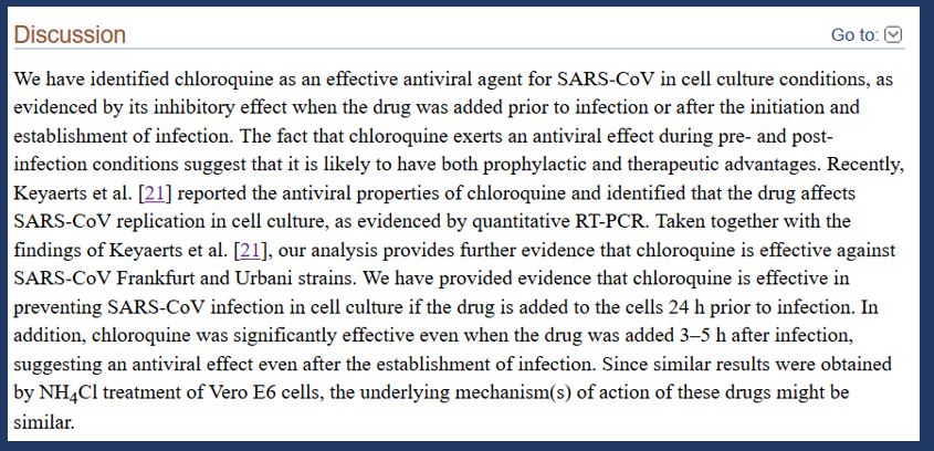 Elle permet de découvrir, avec une facilité déconcertante, l’existence de trois études scientifiques fondamentales, publiées les 9 mars 2004, 28 août 2004 et 22 août 2005, qui ont établi de façon formelle l’efficacité in vitro de la chloroquine dans le traitement contre le SARS-CoV, à condition que la prise de ce médicament se fasse soit avant l’infection, soit dans les jours (si possible même les heures) suivant l’infection.