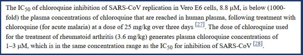 « Les premières études in vitro ont montré que la chloroquine bloque l’infection au COVID-19 à une concentration micromolaire faible, avec une concentration efficace demi-maximale (CE50) de 1,13 μM et une concentration demi-cytotoxique (CC50) supérieure à 100 μM. »