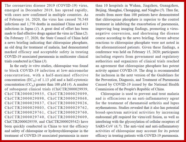 « De gros efforts ont été faits pour trouver des médicaments efficaces contre le virus en Chine. Le 17 février 2020, le Conseil des affaires de l’État de la République populaire de Chine a tenu un point de presse indiquant que le phosphate de chloroquine, un ancien médicament pour le traitement du paludisme, avait démontré une efficacité marquée et une innocuité acceptable dans le traitement de la pneumonie associée au COVID-19 lors d’essais cliniques multicentriques menés en Chine. »