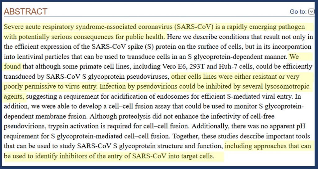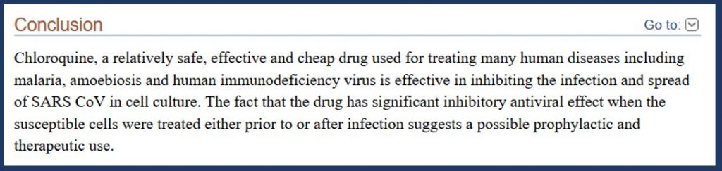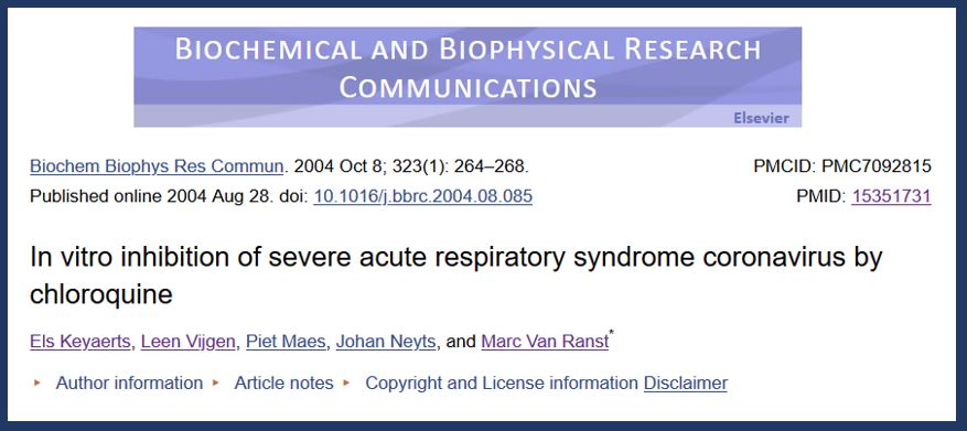 Le titre de cette étude de 2004 est explicite : « In vitro inhibition of severe acute respiratory syndrome coronavirus by chloroquine » – Traduction en français : « INHIBITION IN VITRO DU CORONAVIRUS DU SYNDROME RESPIRATOIRE AIGU SÉVÈRE PAR LA CHLOROQUINE ».