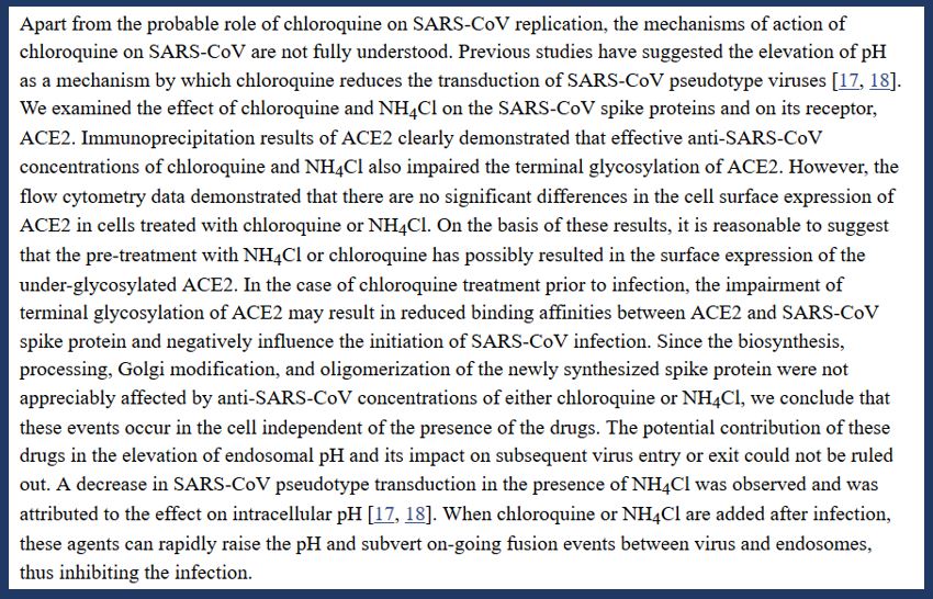 « Des études ont révélé qu’il possède également des activités antivirales à large spectre potentielles en augmentant le pH endosomal requis pour la fusion virus / cellule, ainsi qu’en interférant avec la glycosylation des récepteurs cellulaires du SRAS-CoV (6,7). Les activités antivirales et anti-inflammatoires de la chloroquine peuvent expliquer son efficacité efficace dans le traitement des patients atteints de pneumonie au COVID-19. »