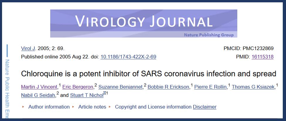 1°) Une première étude, conduite par 6 chercheurs de l’Université de Pennsylvanie, découvre que la chloroquine nuit à la réplication du coronavirus SRAS-CoV. Elle est publiée en ligne le 9 mars 2004.