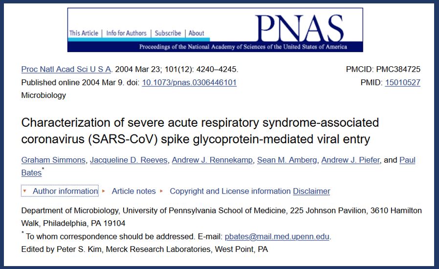 Le titre de cette étude pionnière est de formulation très technique : « Characterization of severe acute respiratory syndrome-associated coronavirus (SARS-CoV) spike glycoprotein-mediated viral entry » – Traduction en français : « Caractérisation de l’entrée virale favorisée par la glycoprotéine de pointe du coronavirus associé au syndrome respiratoire aigu sévère (SRAS-CoV) »