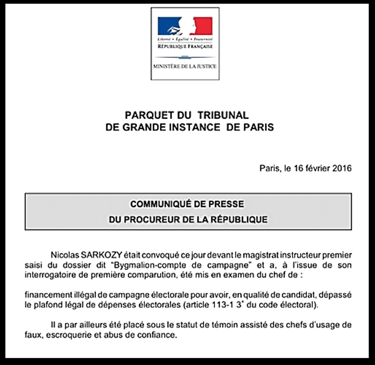 Cette affaire est tellement énorme qu’elle n’a pas pu être complètement étouffée. Le 16 février 2016, Nicolas Sarkozy a été convoqué par le magistrat instructeur du tribunal de grande instance de Paris. À l’issue de son interrogatoire, Nicolas Sarkozy :