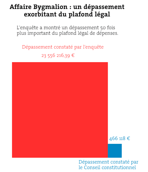 Les investigations ultérieures de la presse et de la justice ont établi que le dépassement s’est élevé, en réalité, non pas à 466 118 euros mais au montant astronomique de 23 556 216 euros. Et cela au moyen d’un montage frauduleux, effectué avec la société Bygmalion, permettant à l’UMP de prendre en charge des dépenses de campagne non déclarées par le candidat.