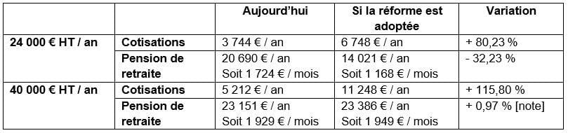 En conséquence, si cette réforme était adoptée, elle entraînerait une hausse vertigineuse du niveau des cotisations sociales des avocats par le doublement des cotisations retraite, et une diminution de leurs pensions de retraite.