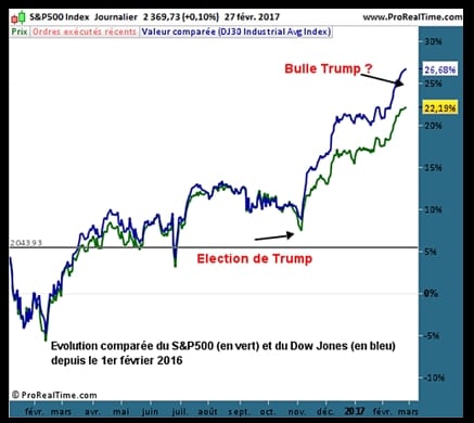 - 6 février 2017 : Jean-Michel Naulot, ex-banquier et ancien régulateur à l’Autorité des marchés financiers, inquiet des évolutions en cours, pense que « Trump est une de ces petites aiguilles qui pourraient crever la bulle financière »