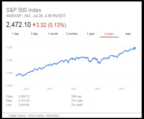 Au 28 juillet 2017, l’indice S&P 500 a atteint… 2 472, et cela malgré un bref plongeon, en novembre 2016, dû à l’élection de Donald Trump, auquel a succédé une forte hausse, les marchés étant satisfaits de la baisse massive d’impôt annoncée par le nouveau président. Ce qui donne le graphique ci-dessous :