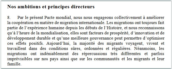 Cependant, dès son préambule, le Pacte explique que les migrations sont « facteurs de prospérité, d’innovation et de développement durable et qu’une meilleure gouvernance peut permettre d’optimiser ces effets positifs », confondant là encore volontairement tout type de migration et toute sorte de situation.