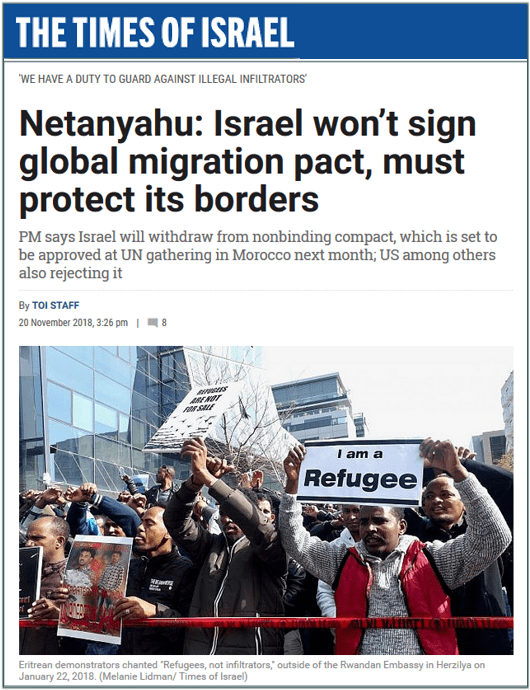 Le Premier ministre israélien, Benjamin Netanyahu, a annoncé qu’il ne signerait pas le Pacte et a déclaré le 20 novembre 2018 : « Nous avons le devoir de protéger nos frontières contre les infiltrés illégaux. C’est ce que nous avons fait et c’est ce que nous continuerons de faire. »