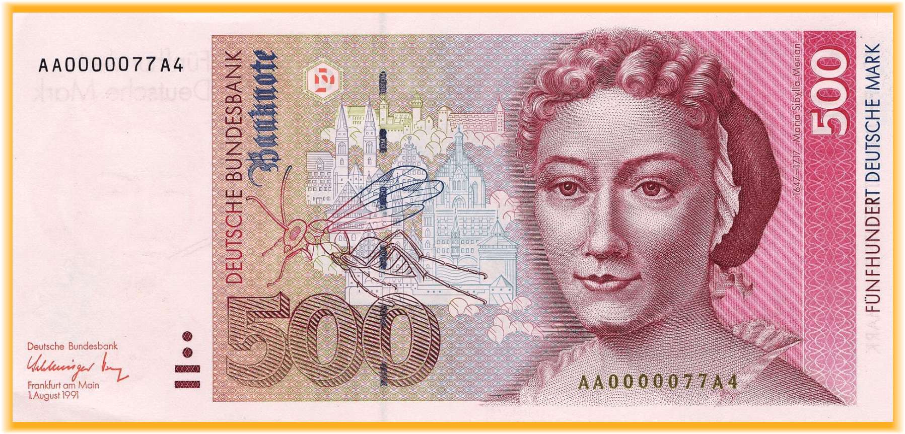 Imprimé en août 1991, ce billet de 500 Deutsche-Mark porte (en bas à gauche) les signatures conjointes de Helmut Schlesinger, président de la Bundesbank de 1991 à 1993 (signature de gauche) et de Hans Tietmeyer, vice-président de la Bundesbank (signature de droite). Hans Tietmeyer succéda à Schlesinger comme président de la Deutsche Bundesbank de 1993 à 1999, ce qui fit de lui le dernier président de la banque centrale allemande avant le transfert des pouvoirs monétaires à la BCE. Helmut Schlesinger est actuellement toujours en vie (âgé de 94 ans) mais Hans Tietmeyer est décédé en 2016.