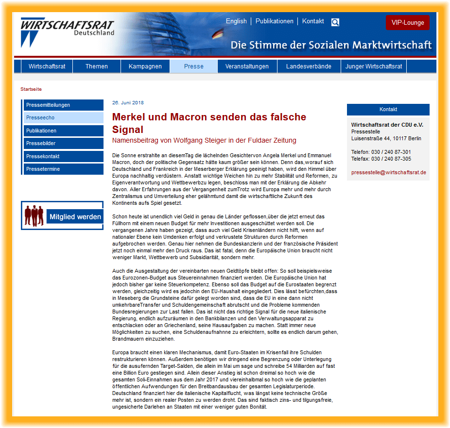 Or, le Wirtschaftsrat, ce n’est pas de la gnognotte. C’est la structure qui regroupe ce que l’on appellerait, chez nous, les responsables nationaux des questions économiques et monétaires de ce parti. Et la CDU, ce n’est pas l’AfD : la CDU est actuellement le parti politique le plus important d’Allemagne, c’est le parti de la chancelière Angela Merkel, c’est le parti qui est au pouvoir à Berlin depuis treize ans (novembre 2005). Les opinions qui sont formulées au sein de son Conseil économique officiel ne sont donc pas à prendre à la légère, et n’ont d’ailleurs pas été rendues publiques à la légère non plus !