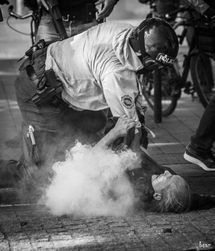 Un cliché montrant un homme très âgé immobilisé au sol, à Nantes, avec la main d’un policier qui semble s’apprêter à l’étrangler, a été posté dimanche sur Facebook par la photographe Bsaz, pour illustrer le déchaînement de violences décidé par le régime de Macron à l’encontre du peuple français.